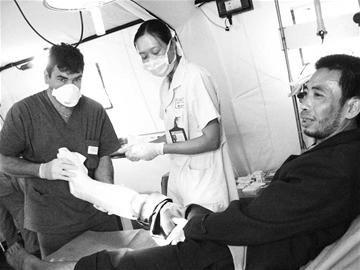 昨日上午10點(diǎn)半,設(shè)在綿竹孝德鎮(zhèn)的意大利醫(yī)療野戰(zhàn)醫(yī)院手術(shù)室里抬進(jìn)了一名在地震中骨折的傷者。汗水從骨科醫(yī)生朱力亞諾·羅迪尼的額頭上滲出來,他一邊比劃著詢問傷者的情況,一邊用藥物清洗已經(jīng)感染的部位。此刻,對(duì)朱力亞諾·羅迪尼這樣的國(guó)際志愿者來說,他只知道自己是醫(yī)生,他要醫(yī)治好更多的傷者。