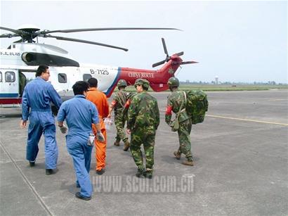 5月21日清晨,廣漢機場緊張有序地展開營救8名被困工人的行動,多架飛機飛向綿竹清平大山偵察?战当硯熍沙鲂》株,背著繩索、攜帶衛(wèi)星定位系統(tǒng)進(jìn)行救援。