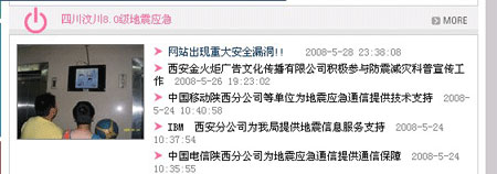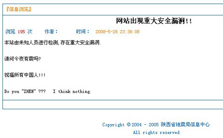 28日23時38分,記者正常登錄到陜西省地震局網(wǎng)站(陜西省地震信息網(wǎng))時,在該網(wǎng)站首頁“四川汶川8.0級地震應急”欄目中發(fā)現(xiàn)一條題為“網(wǎng)站出現(xiàn)重大安全漏洞”的信息,點擊進入后內(nèi)容顯示“本站由未知人員進行檢測,存在重大安全漏洞”,并隨后附有三條“網(wǎng)友留言” 。