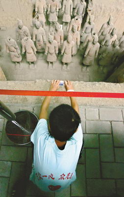 昨日,臨潼溫度高達(dá)33攝氏度,熾烈的陽(yáng)光并沒(méi)阻擋人們參觀的熱情。這也是汶川地震發(fā)生后第一個(gè)大型節(jié)假日。早上9時(shí),記者在兵馬俑售票處看到,兩個(gè)窗口排滿(mǎn)了大約15個(gè)人,而另外幾個(gè)窗口則“冷清”很多。大量來(lái)自省內(nèi)的游客在購(gòu)票進(jìn)場(chǎng)。