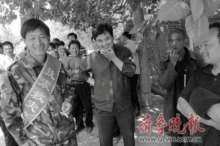 村頭的大樹上掛著“歡迎抗震救災(zāi)英雄回家”的紅色條幅,全村的父老鄉(xiāng)親都涌了出來(lái),站在小路邊夾道歡迎,十個(gè)人一下車,鞭炮聲便響個(gè)不停。鄉(xiāng)親們摸摸這個(gè)、瞧瞧那個(gè),想看看平日里見慣了的這幾個(gè)人是不是突然長(zhǎng)了三頭六臂。