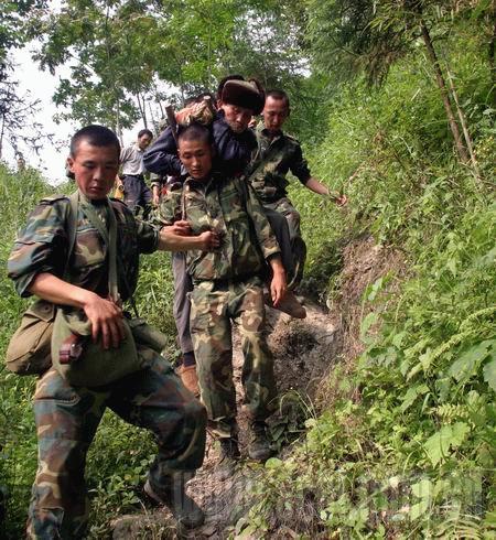 一大早,我們160人每人背著40公斤給養(yǎng)、物資、器材開始翻越這座大山。政委說,茶坪老百姓需要我們。在翻越一個(gè)峭壁時(shí),列兵侯軍腳下一滑摔倒了,旁邊就懸崖,慶幸的是,除背囊隨著山石滾下山崖,侯軍本人安全地爬了起來。九個(gè)小時(shí)后,我們終于到達(dá)茶坪鄉(xiāng)。茶坪鄉(xiāng)副鄉(xiāng)長(zhǎng)張平一見到我們,就撲通一聲跪在了參謀長(zhǎng)面前說:“人民子弟兵來了,茶坪就有希望了……”參謀長(zhǎng)一把將他扶起,兩個(gè)漢子都淚流滿面。