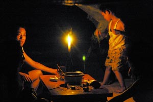 入夜,電路無法覆蓋的山上臨時(shí)安置點(diǎn),居民只得秉燭談心。