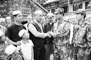 悠長的誦經(jīng)聲在“帳篷清真寺”四周縈繞。蒿溪回族鄉(xiāng)鄉(xiāng)長魏光忠正巧上山來查看危房!爱(dāng)年,紅軍經(jīng)過此地,與當(dāng)?shù)鼗、漢群眾結(jié)下了深厚的情誼。今天,‘民族大團(tuán)結(jié)、軍民一家親’的動(dòng)人情景在蒿溪再現(xiàn)!蔽汗庵腋嬖V記者,連日來,部隊(duì)官兵搜救搶險(xiǎn)不懼艱險(xiǎn),運(yùn)送物資不知疲倦,還專門開設(shè)了多個(gè)“清真救助站”。