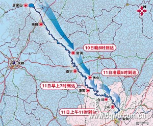 唐家山堰塞湖下瀉的洪水正向重慶奔來,預(yù)計今日凌晨5時進(jìn)入(重慶)潼南米心鎮(zhèn),今上午11時到達(dá)北碚。