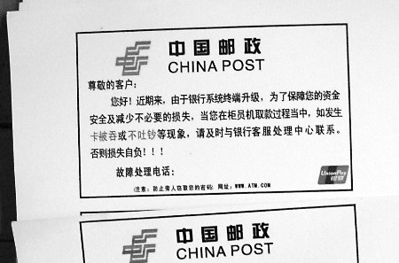 經(jīng)過審訊,班某和甘某很快交代了他們詐騙作案的過程。據(jù)二人交代,他們先用塑料板將ATM機(jī)的出鈔口堵住,并在ATM機(jī)上貼上提示,內(nèi)容是:“尊敬的客戶,當(dāng)您取款不出鈔時(shí),請及時(shí)撥打銀行服務(wù)電話××××、××××與客服中心聯(lián)系,否則后果自負(fù)(上圖)。有粗心的客戶提款不出鈔時(shí),可能會(huì)撥打廣告牌上的服務(wù)電話。