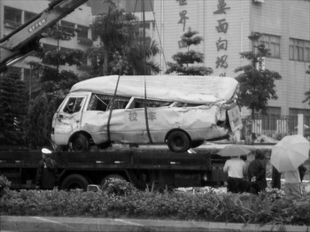 事故發(fā)生后,被圍墻砸中已變形的校車被吊出現(xiàn)場。本報記者韓成良 攝