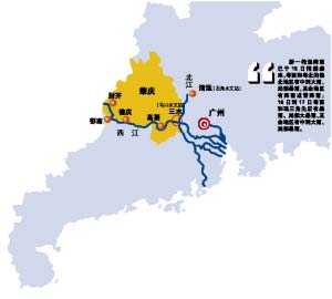 據(jù)省水文局最新預報:西江高要水文站將于16日凌晨出現(xiàn)48000立方米每秒的洪峰流量,超過20年一遇量級洪水,洪峰水位11.4米,超警戒水位1米以上。由于北江與西江兩股洪水將于16日在三水匯合,因此,屆時西江最下游的馬口水文站將于16日中午出現(xiàn)8.4米的洪峰水位,超過50年一遇量級。