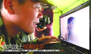 “看見(jiàn)啦!hello,媳婦兒!”昨日16:18,都江堰學(xué)府路一處板房搭建地的綠色帳篷內(nèi),27歲的新郎倌終于看見(jiàn)了電腦屏幕上穿著潔白婚紗的新娘。整個(gè)婚禮僅僅持續(xù)了9分鐘,這是一場(chǎng)簡(jiǎn)單得不能再簡(jiǎn)單的婚禮,卻跨越了千里!新郎倌因?yàn)殡S部隊(duì)入川參加抗震救災(zāi),無(wú)法如期趕回安徽家中與新娘舉行婚禮,便通過(guò)這種方式,完成了對(duì)新娘的承諾。