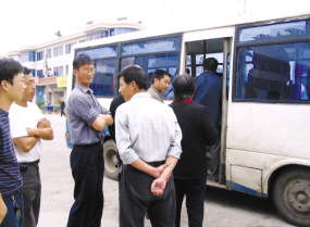 通知發(fā)出的第3天,進入茅山集鎮(zhèn)的路口突然出現(xiàn)手持警棍的12名執(zhí)法隊員,他們一字排開,將路口封死,嚇得客車連忙下客,將乘客丟在雨中,匆匆回頭。第4天,司機們索性將車停在離集鎮(zhèn)入口100米的“高璟超市“門前,但執(zhí)法隊仍然進行驅(qū)趕,無奈客車只好再退3.5公里,停在茶場一隊。見車主還是不交“保證金”,執(zhí)法隊繼續(xù)干預,將客車又逼退1.5公里左右,停在茶場二隊。此地已經(jīng)距離茅山6公里左右,到了后白鎮(zhèn)境內(nèi)。但心有余悸的司機還是不放心,又向后退出1公里,索性停在茅西小鎮(zhèn)上。