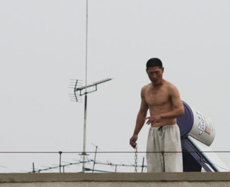 在樓頂?shù)膸讉小時內(nèi),張某一會兒抽煙,一會兒撥打電話,一會兒拽著一個鐵鏈子,將身子探出欄桿向樓下觀望!凹热灰鴺,往下看還拽個鐵鏈干嗎!”大家都覺得張某不是真心想跳樓。