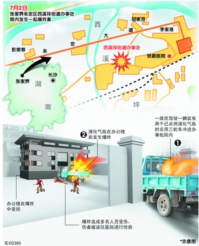 據(jù)張家界警方初步查明,該辦事處彭家巷社區(qū)七組居民田開友,因?qū)ψ约疫`法建筑被有關(guān)部門依法拆除產(chǎn)生不滿,于昨日上午駕駛一輛裝有兩個已點(diǎn)燃的液化氣瓶的農(nóng)用三輪車沖進(jìn)辦事處院內(nèi),在辦公樓前發(fā)生爆炸,爆炸產(chǎn)生的沖擊波造成12名干部和群眾受傷。田開友在案發(fā)5分鐘后被警方抓獲。據(jù)了解,西溪坪街道位于張家界市區(qū)東部,東臨慈利縣金巖,南連大坪鎮(zhèn),西接官黎坪街道辦事處,北有澧水河與陽湖坪鎮(zhèn)相望,是張家界市新興的旅游工業(yè)開發(fā)區(qū),人口3.53萬人,轄23個建制村、3個居委會。