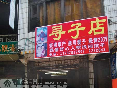 湖北人彭高峰苦苦尋子無果,在深圳開起懸賞“尋子店”。7月4日,記者在藤縣街頭也看到一個類似的“尋子店”,店主黃佩云告訴記者,她兒子莫鴻濤失蹤近5個月,警方至今沒有立案。她在網(wǎng)上看到彭高峰的事情后,無奈之下也效仿他在街頭開起“尋子店”,懸賞20萬元尋子。