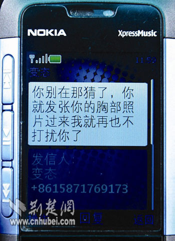 “你只要把胸部照片發(fā)過來,我就罷手!弊蛉,收到對方提出的無理要求,漢口女士小霞(化名)精神幾乎崩潰。近半個月來,這樣的下流電話和短信每天都在折磨著她。