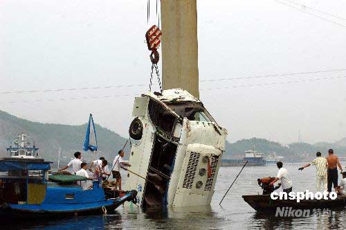2008年7月12日,湖北宜昌市發(fā)生車輛撞破橋梁護欄墜河事故,目前已造成5人死亡,4名失蹤者正在尋找中。中新社發(fā) 方佩 攝