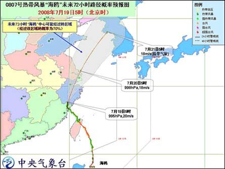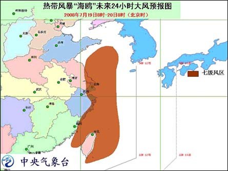 中新網(wǎng)7月19日電 中央氣象臺(tái)7月19日06時(shí)發(fā)布臺(tái)風(fēng)消息:今年第7號(hào)強(qiáng)熱帶風(fēng)暴“海鷗”于昨天晚上在福建省霞浦縣境內(nèi)減弱為熱帶風(fēng)暴,今天早晨5時(shí)其中心位于浙江省泰順縣境內(nèi),就是北緯27.6度、東經(jīng)119.8度,最大風(fēng)力有8級(jí)(20米/秒)。預(yù)計(jì),風(fēng)暴中心將以每小時(shí)15-20公里的速度向北偏東方向移動(dòng),強(qiáng)度繼續(xù)減弱。