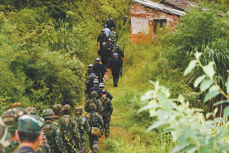 案發(fā)當(dāng)天晚上7時(shí),永豐縣委政法委就從各個(gè)鄉(xiāng)鎮(zhèn)抽點(diǎn)干部和民兵預(yù)備役人員配合警方圍捕嫌犯。于此同時(shí),吉安市公安局特警支隊(duì)、武警江西總隊(duì)吉安支隊(duì)也都派出大批警力連夜趕赴到永豐增援。特警支隊(duì)長朱小明說,他們除了參與搜山外,還擔(dān)負(fù)堵截、埋伏和狙擊的任務(wù)。永豐縣委副書記、政法委書記劉曉聰說,圍捕工作分為四大塊,主要是偵查、堵卡、調(diào)查取證和搜山,參與圍捕的人數(shù)超過800人。