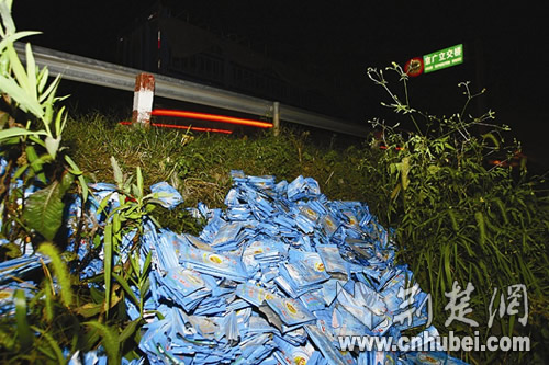 昨晚9時(shí)許,記者趕到現(xiàn)場(chǎng)看到,京廣立交橋離孝感主城區(qū)約1公里左右,是107國(guó)道與京廣線的交會(huì)處,奶粉袋位于107國(guó)道橋頭的雜草叢中,每5個(gè)空袋用橡皮筋捆為一扎。記者隨手翻開了兩扎,發(fā)現(xiàn)奶粉袋上灰塵不多,袋口均有撕開的痕跡,上面標(biāo)注的生產(chǎn)日期從2006年3月到9月不等,保質(zhì)期為18個(gè)月。