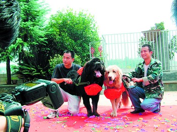 婚禮現(xiàn)場(chǎng),保國、千金被雙方的主人牽著踏上紅地毯。保國又蹦又跳,不停地大聲吼叫,像個(gè)斗士;千金則要溫順得多,慢慢地跟著主人走。拍結(jié)婚照的時(shí)候,戴著大紅花的兩只藏獒格外精神。隨著主持人一聲“禮成”,彩紙漫天飛舞,兩只藏獒被牽入裝修一新的“洞房”。