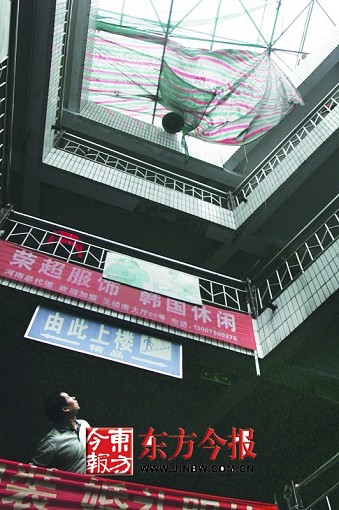 在棚頂最南邊還懸掛著一塊用來接掉落油漆的5平方米大的彩條塑料布。批發(fā)市場(chǎng)的保安小胡說,出事時(shí),他正巧在4樓巡邏,看到男孩先是掉落到塑料布上,然后又掉到了下面。