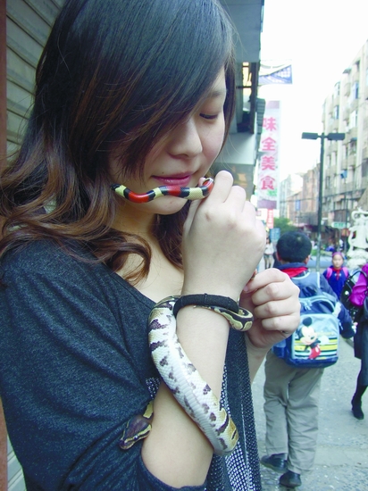 寵兒是這家小店的?停捎谒貏e喜歡養(yǎng)寵物,所以干脆給自己起了一個網(wǎng)名叫“寵兒”。雖然寵兒已經(jīng)養(yǎng)了兩條寵物蛇,但她還是經(jīng)常到店里來“探望”其它的蛇。
