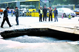 記者在現(xiàn)場看到,大坑邊緣的柏油路面下已懸空。多輛水泥罐車和挖掘機正在現(xiàn)場搶修,往坑內(nèi)灌注混凝土。市應急辦、市公安局等有關(guān)部門及西城區(qū)政府相關(guān)負責人趕赴現(xiàn)場指揮。