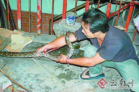 前日凌晨5點,接到景洪市畫家楊洪榮的熱線電話,記者從睡夢中躍起,驅(qū)車趕到位于版納氣象局住宿區(qū)內(nèi)的一間民宅。只見其二樓陽臺上燈火通明,7名男女的身影正在樓上緊張地晃來晃去,原來,楊洪榮的家中發(fā)現(xiàn)了一條手臂粗的蟒蛇,幾人正在與蟒蛇進行著激烈的搏斗。