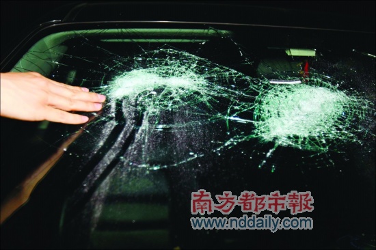 事發(fā)梅林一村84棟北側(cè)停車場。記者昨天下午6時左右趕到現(xiàn)場看到,被砸爛的是一輛黑色馬自達6轎車,該車的前擋風(fēng)玻璃有兩處拳頭大小的被砸痕跡,右前車窗整塊玻璃中間有一個被鈍器擊打造成的大口子。
