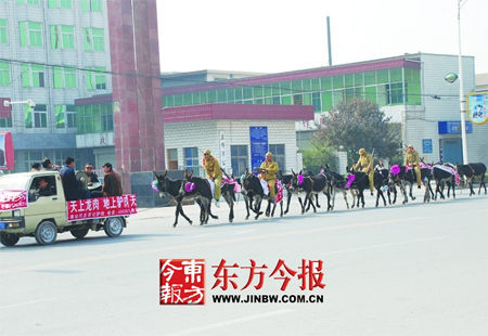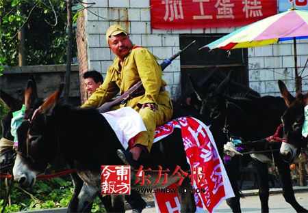 這支“耀武揚威”的隊伍由四名身穿日本帝國主義軍裝、騎著毛驢的男子組成,由于他們牽的毛驢有十多頭,所以隊伍有二三十米長。在隊伍前方,一輛面包車上還有一支樂隊,嗩吶聲、镲鈸聲不絕于耳,場面著實壯觀。