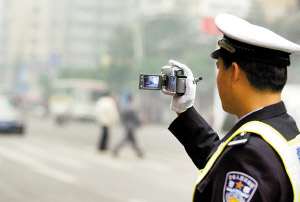 沙區(qū)交警在攝像糾違。交警以后將推行陽(yáng)光執(zhí)法,在攝像點(diǎn)前擺放醒目標(biāo)識(shí)。