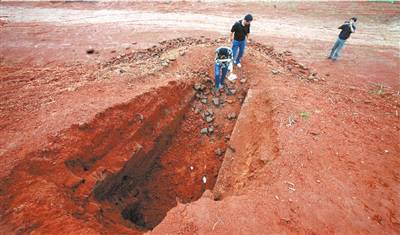 從山坡上可以看到出土漢代耳珰的平臺(tái)已經(jīng)被挖空了一大塊。據(jù)唐濤介紹:“6月初他們剛剛開工不久,我們(郴州市文物管理處)6月4日就在這塊被挖空的平臺(tái)發(fā)現(xiàn)了一座漢代磚室墓,當(dāng)時(shí)下達(dá)了‘停工通知書’,告知建設(shè)方,需經(jīng)我們對(duì)墓葬發(fā)掘后才能再動(dòng)工!钡且患埼臅缡链蠛#恢菔形奈锕芾硖帥](méi)有接到建設(shè)方的任何回復(fù)。