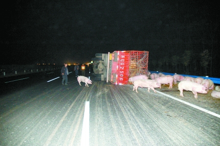 一輛滿載40多頭活豬的貨車側(cè)翻后,10頭豬當(dāng)場(chǎng)死亡,另外30多頭豬開始搖頭晃腦地在高速路上撒歡兒,這可把過往的司機(jī)嚇壞了,10多人組成的救援隊(duì)開始了持續(xù)一個(gè)半小時(shí)的“人豬大戰(zhàn)”。