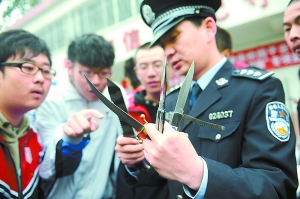 即日起至12月20日,警方和(北京)市教委聯(lián)合在本市大、中、小學(xué)校收繳管制刀具,并清理校園周邊販賣管制刀具的攤販。前天,西城警方率先走進(jìn)北京實(shí)用美術(shù)學(xué)校,通過真實(shí)的案例和實(shí)物,向?qū)W生宣傳什么是管制刀具,管制刀具有什么危害,呼吁學(xué)生配合此次收繳行動。