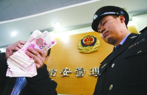 昨日,北京治安管理總隊(duì),獲得2萬(wàn)元獎(jiǎng)勵(lì)的非法煙花舉報(bào)人李先生清點(diǎn)自己的獎(jiǎng)金。 記者 張濤 攝