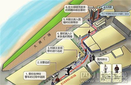 內(nèi)江市中區(qū)人民法院位于鬧市區(qū)的民族路中段,商鋪林立且緊鄰沱江邊的大洲廣場(chǎng)!澳翘煜挛绱蠹s4時(shí)40分,我正好沒生意,看見2名法警將4個(gè)人從法院押出來,準(zhǔn)備押上停在路邊的警車!遍L年在法院大門斜對(duì)面擺煙攤的張氏夫婦,是那天眾多目擊群眾中看得最清楚的人。“4個(gè)人是在2名法警押送下排隊(duì)走出法院大門口的,走在最前面那個(gè)小個(gè)子沒有戴手銬。剛出法院大門,他趁法警不備將衣服一脫,以飛快的速度沿著街邊人行道直往中醫(yī)院方向飛奔而去。見庭審罪犯脫逃,一名身穿制服的法警,一邊大呼‘站住,不準(zhǔn)跑’,一邊朝那名小伙子緊追而去!