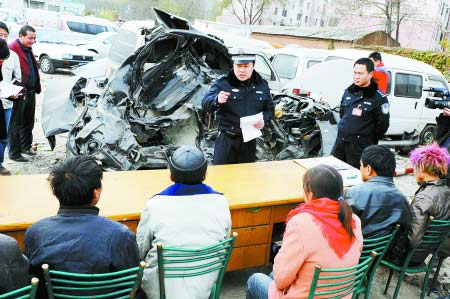 在事故停車場(chǎng)內(nèi),民警鄭敏軍將7人帶到了一輛已成廢鐵的事故轎車旁,告訴他們:11月21日,在鄭密路上,一輛東風(fēng)大貨車在違法超車時(shí),從右前側(cè)撞上這輛比亞迪F3轎車,轎車被撕裂為兩半,轎車司機(jī)當(dāng)場(chǎng)死亡。而貨車司機(jī)也為自己的行為付出了慘痛的代價(jià)。“很多事故都是由我們違法駕駛導(dǎo)致的,眼前就是一個(gè)很慘痛的教訓(xùn)!编嵜糗娬f(shuō)。