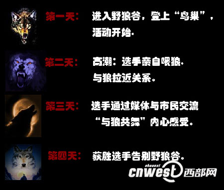 據(jù)西安秦嶺野生動物園負(fù)責(zé)人任飛翔介紹,該園將在陜西省內(nèi)招募三名年齡在二十二歲至四十五歲之間,寫作能力強(qiáng),善于使用照相機(jī)、攝像機(jī),膽量過人且有一定戶外生存經(jīng)驗(yàn)的男士,于十二月八日進(jìn)入野狼谷指定活動區(qū)域——酷似“鳥巢”的茅草棚居住三天。 期間吃、喝、拉、撒、睡均在“鳥巢”里度過。要求他們記錄下野狼的活動規(guī)律、生活習(xí)性、等級序列、幫派體系,以及狼與狼之間的情愛恩怨,狼與人之間的關(guān)系和挑戰(zhàn)者的感受。按要求完成挑戰(zhàn)任務(wù)者,將獲得五千元人民幣獎金,并頒發(fā)榮譽(yù)證書。