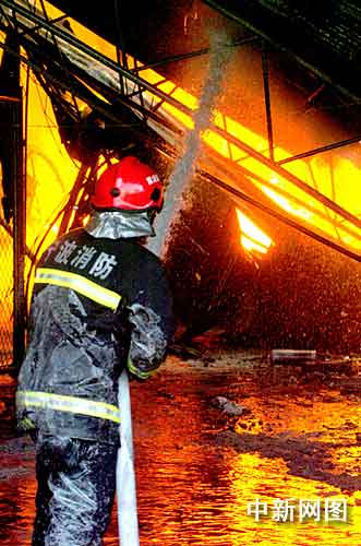 消防官兵迅速利用現(xiàn)場4輛大功率消防高噴車對著火場進(jìn)行撲救,由于官兵到場時火災(zāi)正處于猛烈燃燒階段,廠區(qū)內(nèi)的消防用水一時間得不到滿足,消防部門迅速組織車輛對周邊的河道進(jìn)行吸水,確保了現(xiàn)場用水的需要。