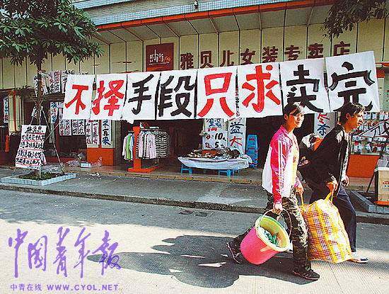 小李的老家在安徽阜陽(yáng),來(lái)東莞打工有6年了,他和愛人及兩歲大的兒子住在一處破舊的出租屋里。談起已經(jīng)離開工廠回家的同鄉(xiāng),小李感慨說:“現(xiàn)在回家又能怎么樣呢,農(nóng)村一家人才一畝多地,種什么都不劃算。”為了養(yǎng)家糊口,李剛不得不四處打聽找事做,后來(lái)在老板的默許下,他和幾個(gè)工友一起把倉(cāng)庫(kù)里積壓的鞋子批發(fā)出來(lái)擺到街上去叫賣。小李每天起早貪黑、風(fēng)餐露宿,雖然辛苦,他卻還很欣慰!拔疫@樣算是幸運(yùn)的了,每天多少還有點(diǎn)錢掙,總比呆在家里沒事做好!彼f,他盼望著到年底了,買賣好起來(lái),多掙點(diǎn)錢帶著老婆孩子回家過個(gè)好年。據(jù)了解,在當(dāng)?shù)剡有好多人像小李一樣,做起了“出口轉(zhuǎn)內(nèi)銷”的小買賣。