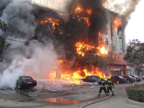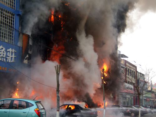 下午四點,記者從中銀大道鑫源福瑞特超市出來,發(fā)現(xiàn)北方有大量煙霧,順煙霧而去,在建設(shè)路口與消防車相遇,共同趕往事發(fā)地點。中銀大道已經(jīng)圍滿了人群,著火的商店火勢猛烈,被燒碎的玻璃啪啪直往下掉,門前的汽車也著了,一輛為晉M89550的紅旗轎車已經(jīng)燒的面目全非了。