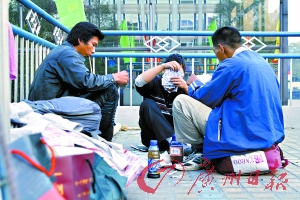 來自黑龍江的老頭其實(shí)不到50歲,雙手有殘疾。他和來自甘肅的小軍已經(jīng)“搭檔”了一年多,關(guān)系最好。聽老頭說,還在北京時(shí),小軍當(dāng)保安,他燒鍋爐,兩人就冒充過便衣警察和嫖客,到酒吧里抓小姐,“弄”到了好幾個(gè)包。后來活做膩了,兩人開始流浪,結(jié)伴南下。從北京到廣州,一路風(fēng)餐露宿,足足走了半年才到。最后選定了人民北天橋這個(gè)據(jù)點(diǎn)。