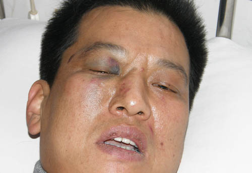 據(jù)他回憶說,12月15日下午,我在杜康花園小區(qū)尚要武家等車去灌液化氣,大約4點鐘左右,一伙不明身份的人(后獲悉是該縣刑警)闖進家中,一人摟著我脖子用手槍指著我頭不讓動,將我摔在地上,另一人將我皮帶抽掉,又把鞋子脫掉,對我搜身,將電話拿走,我說我沒辦違法事,控制我的人用手槍在我頭上砸了兩下說:“不準說話,不許動!贝巳擞孟ドw頂著我脖子,我呼吸困難,我說我出不來氣,掙扎了一下,此人用槍在我頭上砸了一下,又有一人在我胸口跺了兩腳,走到我左側朝我面部、頭上猛跺,隨后將我背銬手銬塞上車(非警車)。