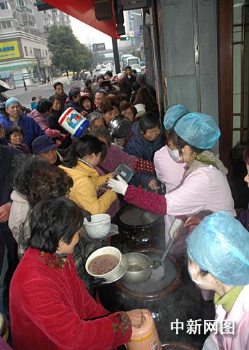 杭州河坊街的施粥情況也有過之而無不及。據(jù)了解,包括方回春堂在內(nèi)的幾家老字號都集中在臘八這一天向杭州市民免費派送臘八粥。“為了能夠在臘八這一天盡早喝到臘八粥,我們幾個老兄弟從昨天晚上12點不到就守在這里了,可是沒想到竟然還有人比我們早。”已經(jīng)喝到熱騰騰的臘八粥的王大爺興奮地說。記者在現(xiàn)場看到,等候施粥的市民隊伍從方回春堂出口出發(fā),一直延伸到了吳山廣場,占據(jù)了整整一條河坊街。