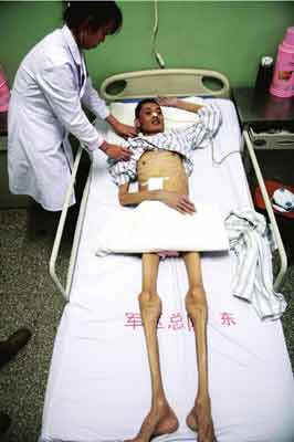 昨天下午,記者在軍區(qū)總院普外科病房見到了耿松峰,他雙臂向上彎曲放在枕邊,右側肩部正進行靜脈營養(yǎng)注射,一袋普通塑料袋大小的乳白色液體已經見底。他說話吃力,但仍然翕動著嘴唇說:“伯伯(指普外科主任)是個好人!鄙砀1.72米、體重曾60公斤的他現(xiàn)在只有33公斤,大腿也只有成年男性手腕粗。他母親用極不流利的普通話說,因為兒子的病,已經家徒四壁,親戚、高利貸,各種借錢的方法都想到了,已經花了20多萬,可還是不夠,兒媳也因此要離婚!艾F(xiàn)在已經欠醫(yī)院5萬塊錢了,可我也不能看著兒子死啊”。
