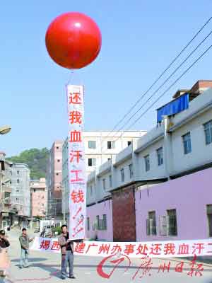 昨日上午,在廣從公路黃莊一帶,一中年男子買來一個(gè)紅色大氫氣球,升起條幅,意欲向包工頭追討3萬余元報(bào)酬。