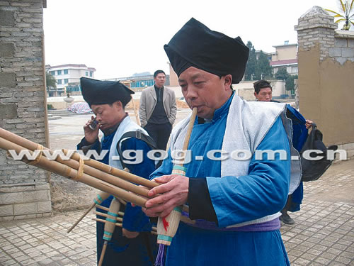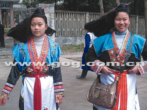記者看見,穿戴盛裝的男子們均身穿青藍色的長衫,外加一件白色的小褂。據(jù)稱,這件小褂名為旗幟褂,上面還繡有夜郎王印,穿戴旗幟褂,這與祖先們打仗有關(guān),他們頭上戴的用黑布包裹的帽子有五個角,看上去讓人頓生威嚴之感(如圖);而夜郎美女們穿戴的是一套漂亮的有各種色調(diào)的衣裙,據(jù)她們說,這叫七江裙,上面記錄有他們的祖先約3000多年前遷徙的歷史。而最令人注目的,還是這些夜郎美女們的發(fā)型。只見她們的頭上均插了一根約兩尺長的竹片,長長的頭發(fā)繞著竹片使頭發(fā)在右側(cè)成了一個半弧形(如圖)。她們告訴記者,這種發(fā)型也是竹王崇拜的一種。
