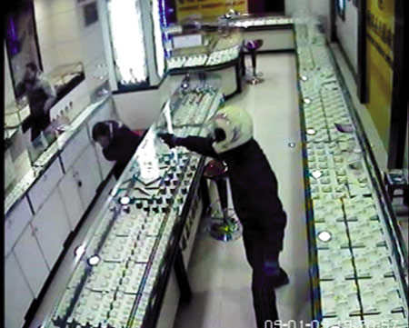 現(xiàn)場錄像顯示,當(dāng)晚7時20分30秒,一歹徒手持鐵錘,將一柜臺的玻璃敲碎,將里面的金屬飾品物品放進(jìn)手提包;5秒后,持槍歹徒在一個角落用槍托狠砸店主何先生頭部;14秒后,珠寶店兩名工作人員趁亂逃離現(xiàn)場;29秒后,手捂頭部的何先生欲離開現(xiàn)場,被歹徒喝令退回,歹徒上前用手槍再次砸傷何先生頭部,并在店內(nèi)慌亂走動;51秒后,持鐵錘歹徒先逃離現(xiàn)場,持槍歹徒緊跟欲逃離;54秒后,持槍歹徒被民警制服。