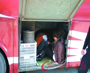 無獨有偶,同日下午2時30分,深圳黃鶴春運執(zhí)勤服務(wù)點民警在檢查豫P66999長途客車的時候,發(fā)現(xiàn)駕駛員劉某神色緊張。民警要求打開該車行李廂檢查,沒想到駕駛員劉某卻很不配合,借口行李太多,不方便檢查。在民警的教育下,司機(jī)劉某極不情愿地打開了行李廂。行李廂里的情況讓民警大吃一驚,4個大活人竟被塞在行李廂中。