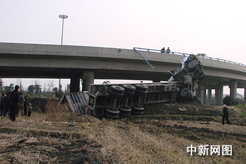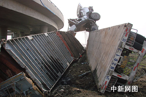 中新網(wǎng)湖州1月23日電(記者袁爽 通訊員汪焱)近日,一輛重型集裝箱半掛車在途經(jīng)申蘇浙皖高速公路皖向織里下主線匝道處時,不僅超速行駛,更是嚴(yán)重超載超限,結(jié)果該車在高速路上玩起了“變形金剛”,釀成慘劇。據(jù)了解,出事車輛碰撞右側(cè)護(hù)欄后翻下落差7米的橋梁。記者俯瞰現(xiàn)場,該車就像是美國大片《變形金剛》里躺下的擎天柱,所幸車上人員受傷較輕,無生命危險(xiǎn)。