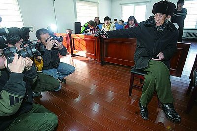 檢察官宣讀起訴書(shū)時(shí),周老漢得到照顧,一直坐在椅子上聽(tīng)。